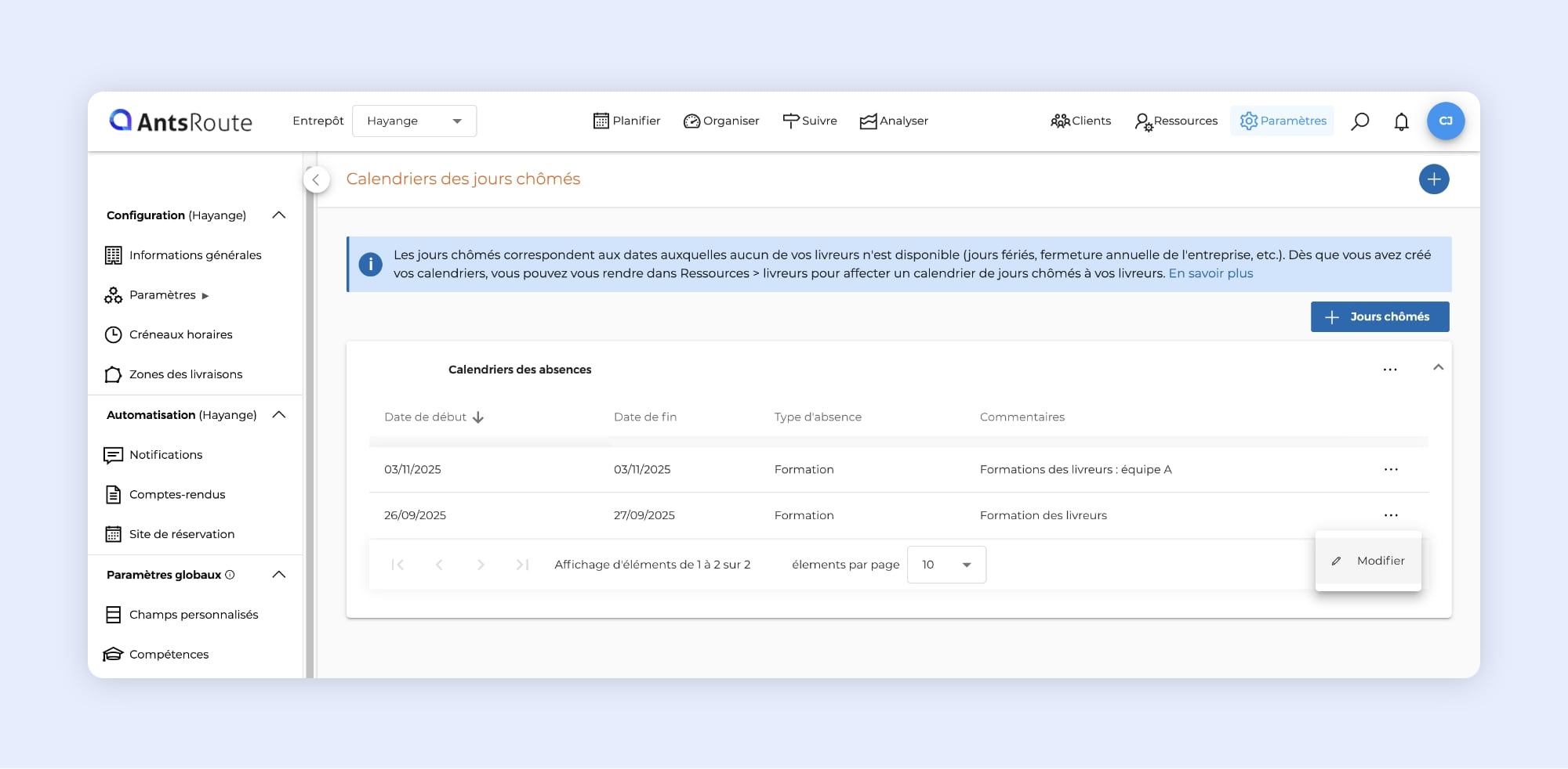 Depuis la fiche de l’agent ou directement dans le calendrier des jours chômés, vous pouvez modifier le type d’absence ainsi que le commentaire associé, même si la date est passée. Vous devez simplement cliquer sur « … » > « Modifier », apportez les modifications nécessaires, puis cliquez sur « Sauvegarder ».