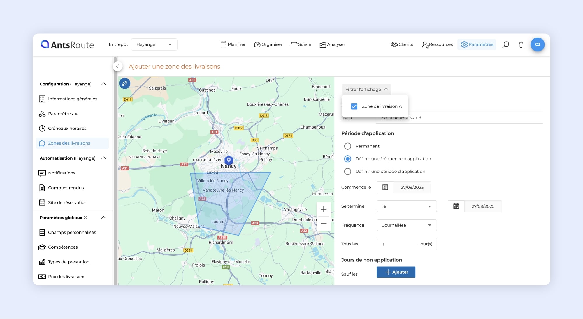 Lors de la création d’une nouvelle zone de livraison, vous pouvez désormais afficher les zones existantes sur la carte grâce au bouton Filtrer l’affichage.