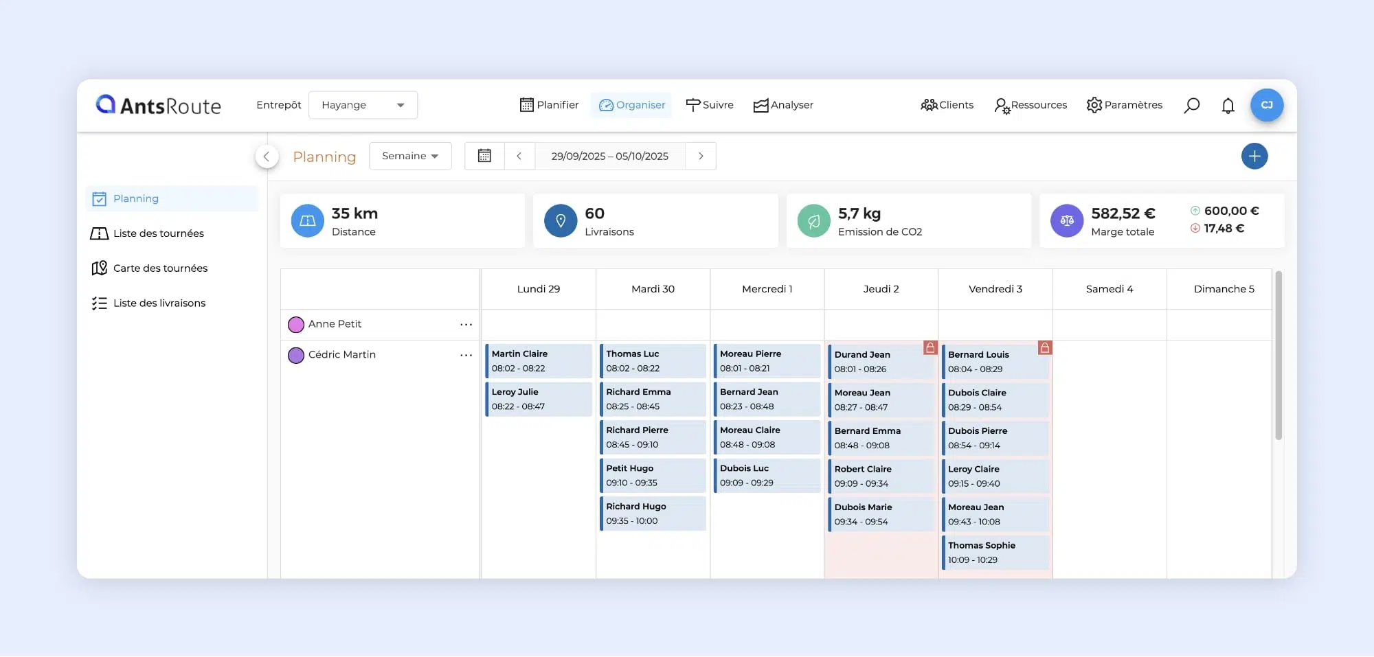 Jusqu’à présent, les tournées verrouillées n’étaient visibles que dans le planning en vue journalière. Dorénavant, elles apparaissent également dans le planning en vue semaine, pour une meilleure lisibilité et un suivi simplifié.