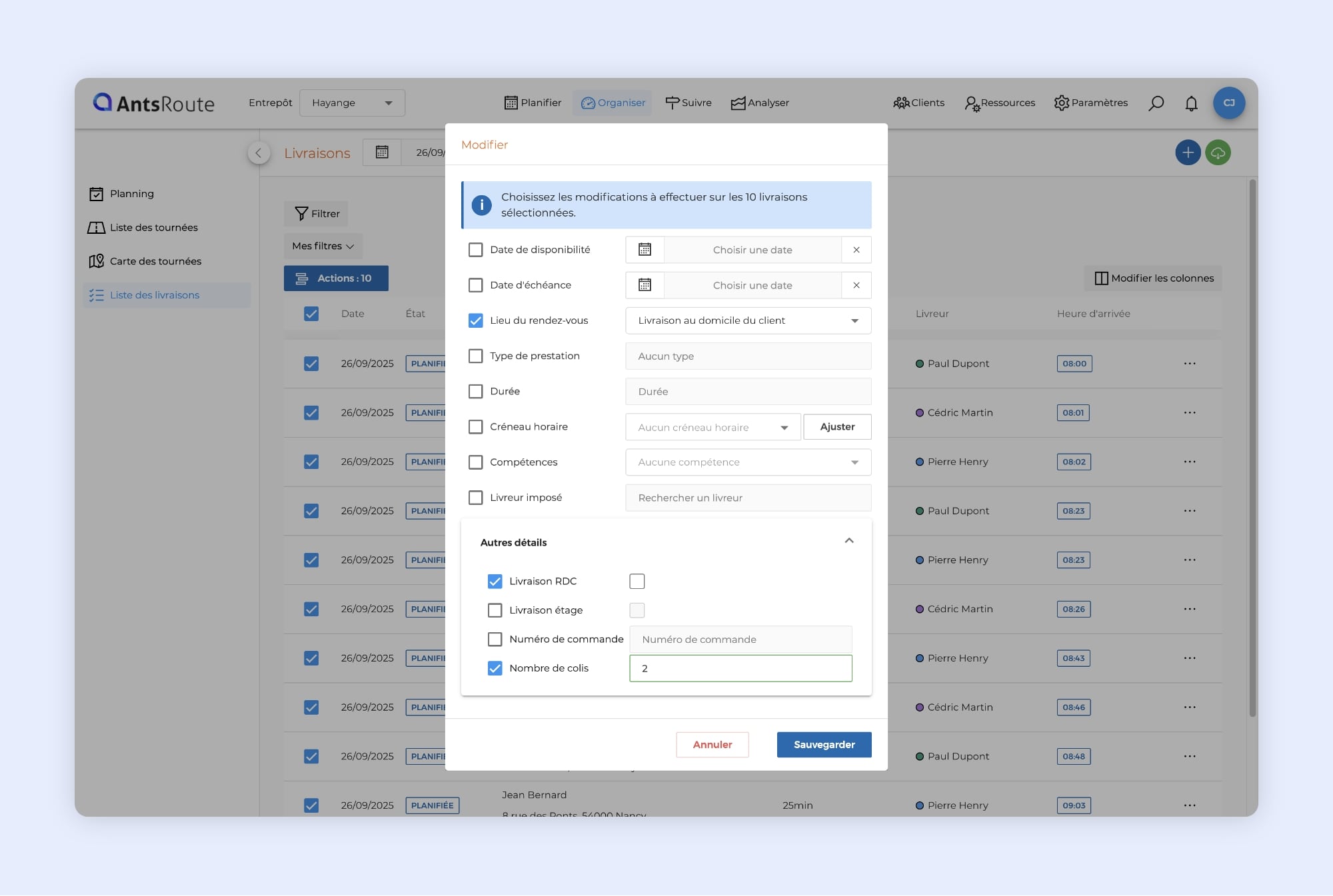 Pour rappel, AntsRoute vous permet de modifier simultanément plusieurs interventions. Vous pouvez ainsi appliquer rapidement les mêmes changements sur un ensemble de rendez-vous sans avoir à les traiter un par un. C’est un gain de temps assuré pour vos planificateurs.