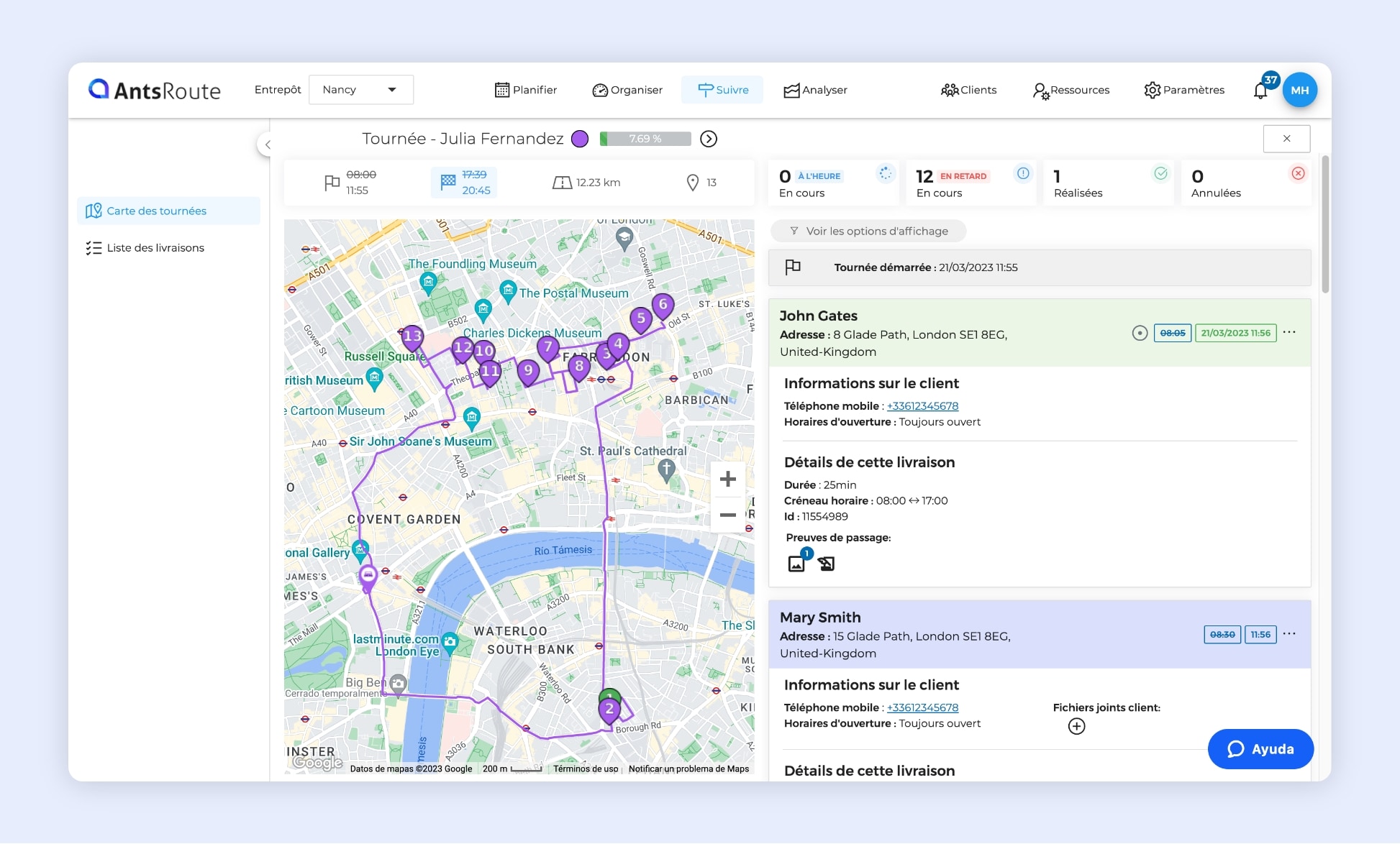 Le suivi de deux tournées en cours sur AntsRoute.